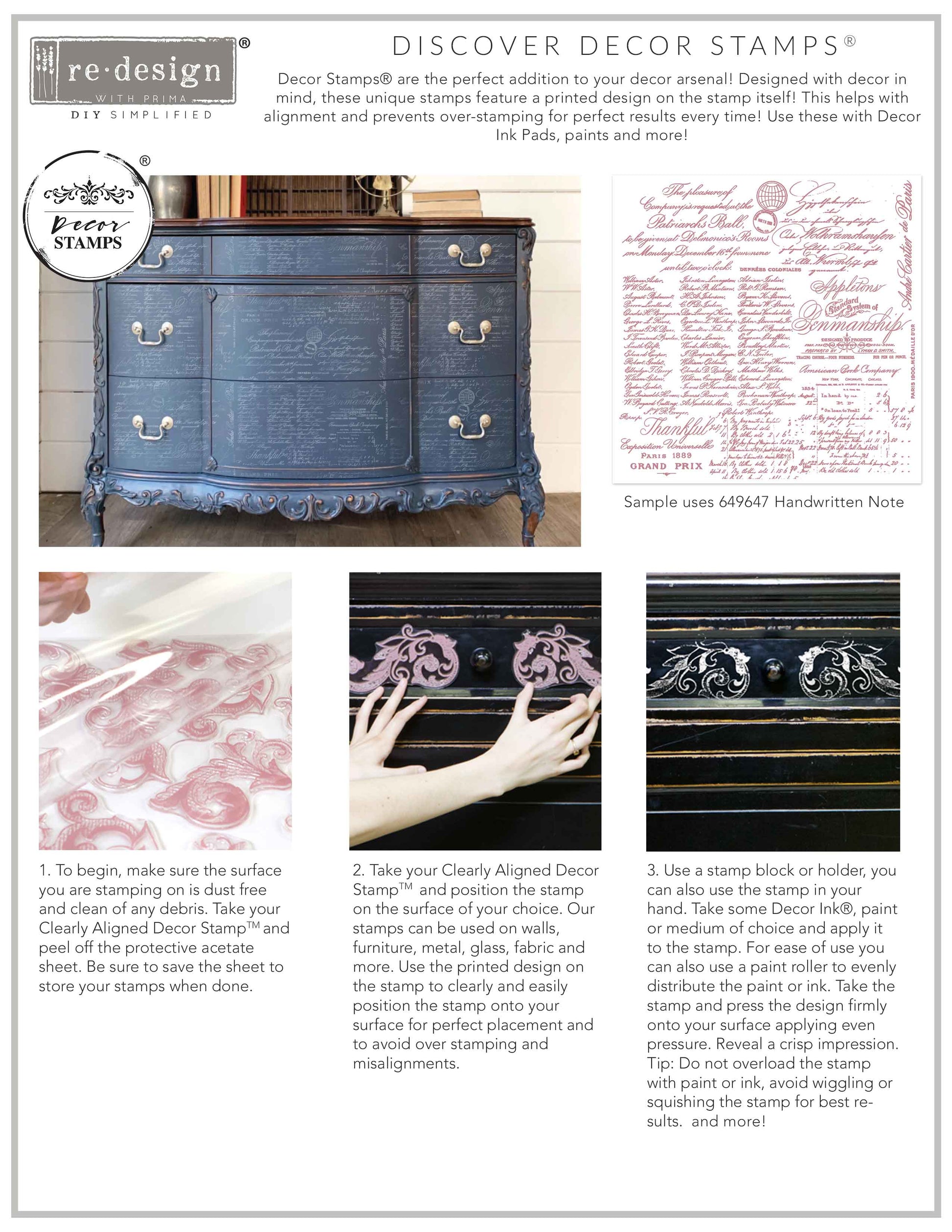 Introducing Clearly Aligned Decor Stamps! Featuring a customized printed design on the clear acrylic stamp itself. The very first of its kind, this feature allows you to clearly align your stamp for perfect placement, while also preventing overstating or misalignments. Seeing the pattern clearly without inking the stamp first is helpful when creating repeating patterns. Create unique and versatile stamped designs on a variety of surfaces while stamping perfectly each time!