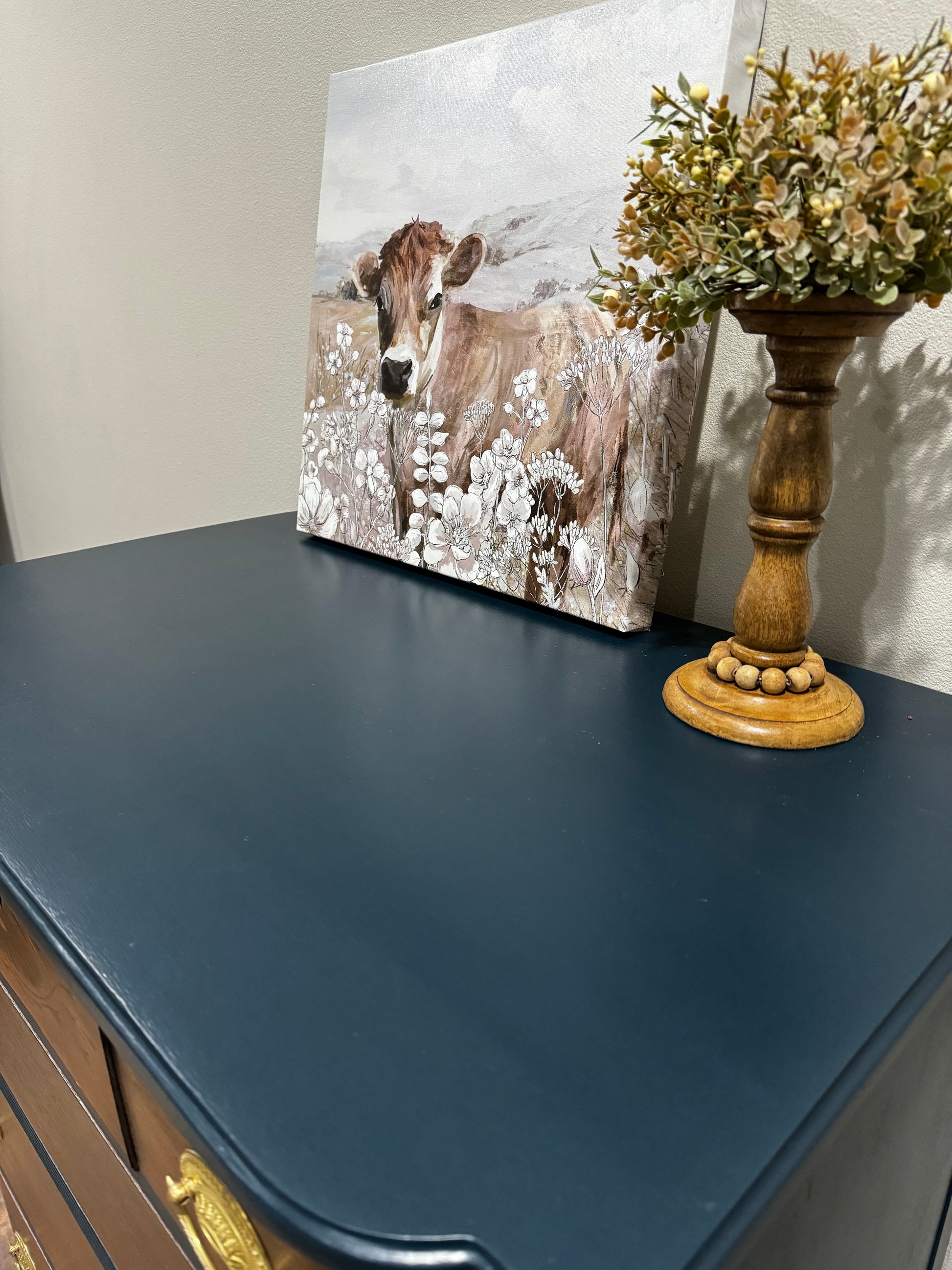 Lovingly restored, her solid mahogany drawers were preserved in their original wood finish to honor the natural grain. The frame, too damaged to stain, was refinished in Sherwin-Williams “Dark Knight”, a deep, rich shade that brings modern sophistication while keeping her classic presence.